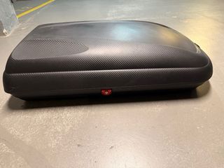 cofre de 550 l muy aerodinámico. tiene dos reparaciones en las dos esquinas delanteras con fibra de vidrio reforzada, a raíz de una grieta en cada esquina por exceso de velocidad ... de unas 15cm cada una .... reparadas y probadas han mejorado de rigidez ..... el cofre lo compré en Julio tengo factura pero lo vendo porque está claro que me limita mucho la velocidad ... si vas a 120-130 genial ..... COSTO 420 € modelo MENABO SATÉLITE XL 550 DÚO NEGRO NO HAY ENVÍO, solo entrega en “mano”