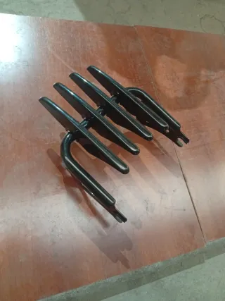 Pieza metálica negra para moto, diseñada para portaequipajes y barra de agarre. - Fabricado en metal negro. - Diseño con múltiples orificios y cortes.