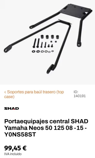 Portaequipajes central SHAD para Yamaha Neos 50 y 125, modelos de 2008 a 2015.
