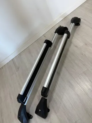 Se venden dos barras portaesquís Thule en buen estado. Ideales para transportar esquís o tablas de snow. - Medidas: 1,20 metros. - Marca: Thule. - Incluye dos juegos de baca.
