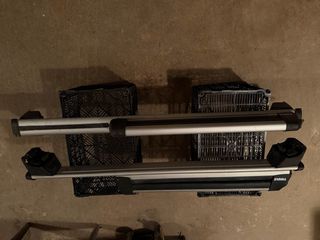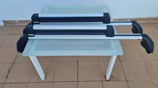 Buen estado, dos barras portaequipajes Thule con llave y pies. Ideales para transportar carga en tu coche o para incorporar portaesquís. - Marca: Thule - Incluye llave y pies - Dos barras