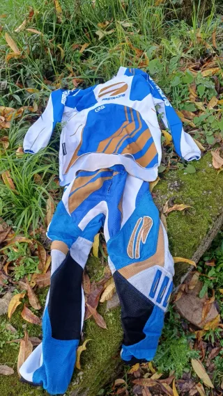 Conjunto de equipación de motocross para niños, con un diseño llamativo en azul, blanco y detalles en dorado. Pantalon talla 22 Camiseta talla 10 - Camiseta de manga larga. - Pantalones de motocross.