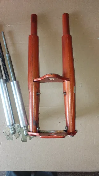1 horquilla para Mobylette Av 88, nueva en su caja, lleva un golpe en la carcasa derecha, lleva muchos años almacenada, falta uno de los muelles, probablemente lo tenga, se salió por debajo de la caja, + otra horquilla de Mobylette también nueva,desconozco el modelo