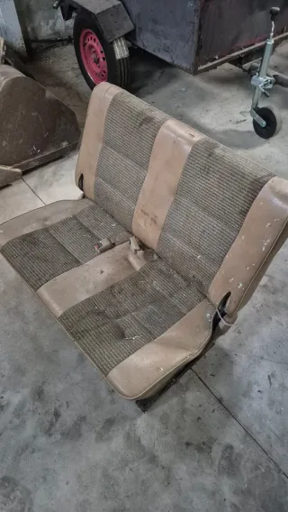 Asiento trasero para Mitsubishi Pajero MK1 3 puertas. Color crema. Esta sucio de estar guardado y de su uso. Si se limpia que queda bien. No tiene ni rotos ni descosidos.