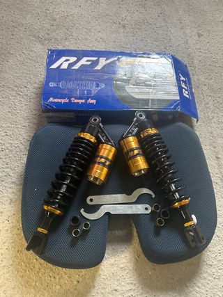 Juego de dos amortiguadores traseros RFY para motocicleta,Quad,mini buggy... -Nuevos a estrenar. - Color negro y dorado. - Diseño de muelle. - Incluye dos llaves de ajuste muelles. Envio📦⚡️📦