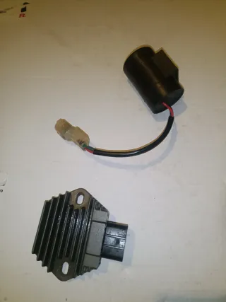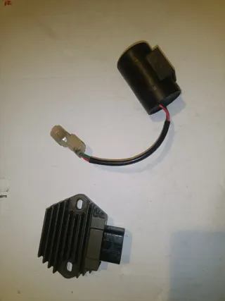 Componentes para quad Honda TRX 450. - Regulador de voltaje con disipador de calor. - Condensador cilíndrico negro con cables.
