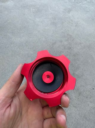 Tapón de repuesto para depósito de moto o quad. Fabricado en aluminio con un acabado rojo brillante.Nunca se ha usado. - Diseño con estrías para un mejor agarre. - Mecanizado CNC.