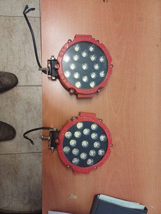 Se venden dos focos LED redondos con carcasa roja. Ideales para 4x4, quad o maquinaria agricola - Diseño circular con 16 LEDs cada uno. - Carcasa de color rojo. - Incluye soportes de montaje. - 12 v