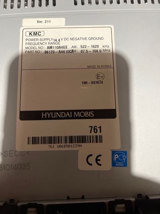 Radio original para KIA CARENS. Vendo autorradio original de un Kia Carens (modelo de 2014) en perfecto estado. Es el equipo original fabricado por Hyundai Mobis, ideal para sustituir tu radio averiada manteniendo la estética oficial y todas las funciones de fábrica. Datos técnicos del modelo: • Part No (Referencia): 96170-A4610GAM • Modelo: AM110A4EE • Fabricante: Hyundai Mobis (KMC) • Origen: Made in Korea • Fecha de fabricación: Mayo de 2014