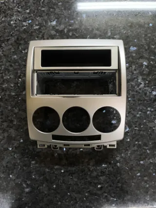Marco embellecedor para la radio de un Mazda 5. Color plateado. - Diseño con espacio para radio y tres círculos. - Incluye soportes de montaje. Puedo incluir la radio alpine por 100 eur mas