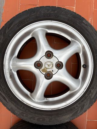 Juego de 4 llantas de aleación para Mazda MX5. - Marca Enkei - Peso 5,9 kg - Tamaño 15” x 6” - Tornilleria 4 x 100 mm - Diseño deportivo de 5 radios. - En buen estado, pero con roces del uso. - Incluye tapas originales con logo. - Los neumáticos estan para cambiar, solo siguen puestos para proteger las llantas. Se venden por cambio de llantas Para recoger, están en el Altet