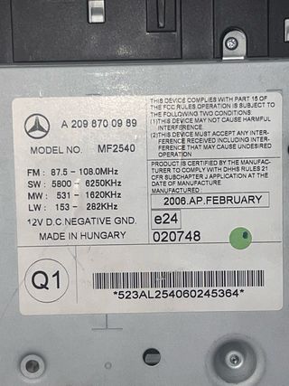 Radio original para Mercedes Clase C. - Radio extraida de un mercedes C220 sportcoupe del año 2007 - Funciones: CDC, CD, RADIO. - Teclado numérico y de teléfono. - Funciona perfectamente