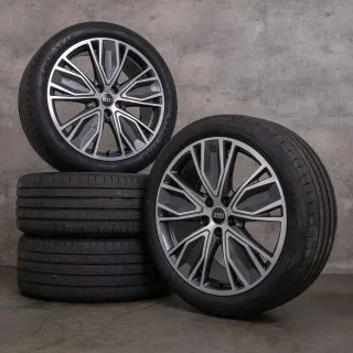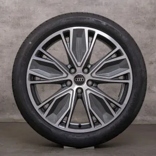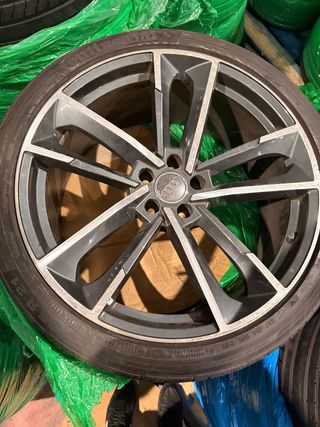 Juego de llantas originales Audi de 21 pulgadas. - Diseño deportivo de 5 radios dobles. - Acabado en gris y detalles pulidos. - Incluye neumáticos Continental nuevos a estrenar 265/40 R21.