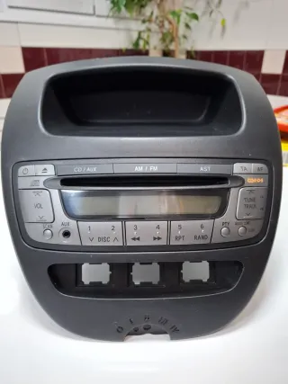 Radio completa y original para Toyota Aygo, Peugeot C7 y Citroën C1. - Modelo con CD/AUX, AM/FM y AST. - Botones de control de volumen, sintonización y selección de pista. - Puerto AUX y ranura para CD.