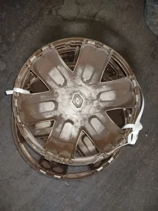 Juego de tapacubos plateados con logo de Renault en el centro. - Diseño de 10 radios. - Acabado metálico. - Bordes con suciedad visible.