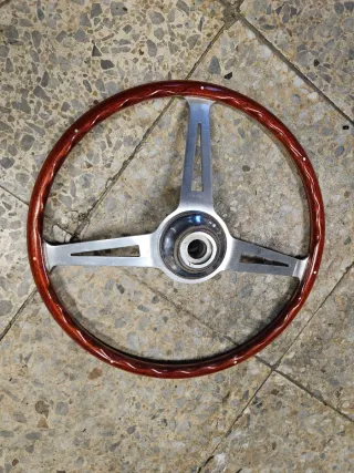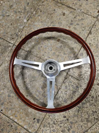 Volante de madera y aluminio para Mini 1300 Cooper.con su piña - Diseño clásico de tres radios. - Aro de madera pulida. - Base central de aluminio.
