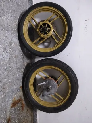 Juego de llantas para Honda Africa Twin 750. RD04 sirven para RD07 - Llantas de radios con aro dorado en buen estado. Sin golpe y centradas. - Incluye neumáticos. Neumáticos viejos. No se venden por separado.