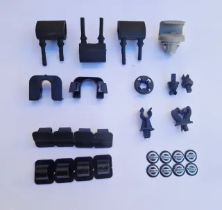 Conjunto de recambios para Derbi Variant. - Piezas metálicas de diferentes colores: negro, rojo, blanco, dorado, azul y gris. - Incluye soportes y tubos.