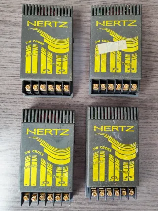 Conjunto de cuatro filtros de frecuencia para equipo de audio de coche. - Componentes Hertz. - Inductores de 0.22mH y 0.47mH. - Condensadores de 1uF y 22uF. - Resistencias de 1Ω5W, 2R2Ω5W y 3R3Ω5W. - Conexiones de tornillo.