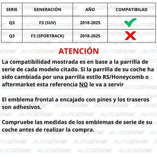 Ref. APCK-048 Material: ABS Color: Negro brillo Compatibilidad: Compruebe la segunda imagen Emblema frontal: 285X99 mm Emblema trasero: 200x71 mm Emblema Q3: Estándar Mida los emblemas de serie de su coche antes de realizar la compra Se pueden añadir varios artículos en un mismo anuncio para pagar solo una vez gastos de envío, para ello contáctenos antes de realizar el pedido Disponemos de varios productos para su vehículo en nuestra web podrá encontrarlos 21% de IVA incluido en el precio, podemos emitir factura. NO negociable no somos particulares IGNORAR: Audi Q3, Audi SQ3, Audi RSQ3, Audi Q3 TDI, Audi Q3 TFSI, S Line