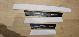 Set de protectores de umbral de puerta con diseño de fibra de carbono para Audi. Incluyen el logo de Audi en color rojo. - Fabricadas en vinilo de fibra de carbono. - Incluyen el logo de Audi. - Varios tamaños para diferentes partes del coche. Ver medidas en las fotos. No se venden por separado.