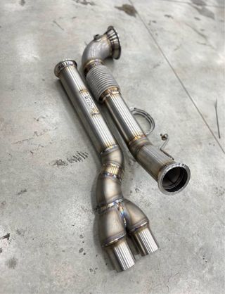 Downpipe de acero inoxidable para Audi RS3 8P y TTRS 8J. Fabricado con materiales de alta calidad para un rendimiento óptimo. - Construcción en acero inoxidable pulido. - Diseño de alto flujo. - Incluye abrazadera y soporte.