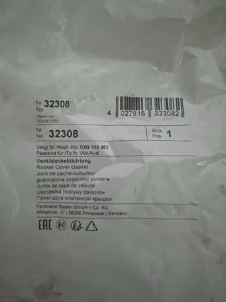 Junta de goma para tapa de válvulas de vehículos del grupo Volkswagen-Audi. - Material: Goma. - Color: Negro. El artículo es una junta de tapa de válvula (Rocker Cover Gasket) del fabricante Ferdinand Bilstein GmbH + Co. KG. Número de pieza: 32308 Número de lote: 0000413552 Referencia de recambio (VW-Audi): 03G 103 483