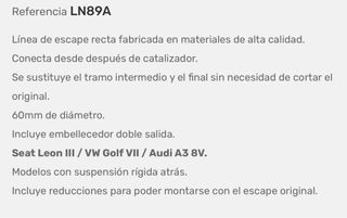 Línea de escape recta sin silenciadores, con poco uso. Fabricada en acero inoxidable para mayor durabilidad. Conecta después del catalizador y sustituye tramos intermedio y final. Modelos compatibles: - Audi A3 8V motor 1.6 o 2.0 tdi - VW Golf VII motor 1.6 o 2.0 tdi - Seat Leon MK3 motor 1.6 o 2.0 tdi Para coches con suspensión rígida trasera. - Diseño de una salida (lado izquierdo) - Diámetro de 60 mm. - Cuento con la de doble salida en carbono de 60x89 mm