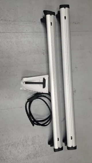 Barras de techo de aluminio para Audi A4 Avant sin usar. Incluye las dos barras principales y accesorios. Ref: 8W9.071.151 - Barras de aluminio plateado. - Tapas negras en los extremos. - Incluye herramienta para montaje.