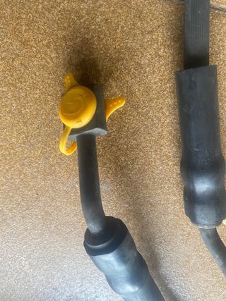 Componente de intercooler para vehículos. - Tubo metálico con conexiones de goma. - Incluye un pequeño depósito o caja negra en un extremo.