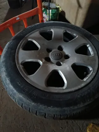 Se vende 4 llantas de audi con 4 gomas una goma esta pinchada las demás estaban bien están al 60/ y las llantas están bastante bien precio no negociable - Diseño de 10 radios. - Acabado plateado.