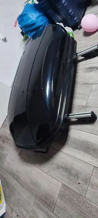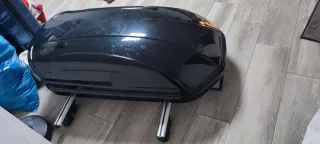 Cofre de techo para coche, ideal para transportar equipaje adicional. - Color negro brillante. - Diseño aerodinámico. - Sistema de fijación incluido. Tiene llave de cofre y llave de los acoplas. Un mes de uso prácticamente nuevo costó 300€ Yo lo tenía puesto en un Audi A4 de siete avant .