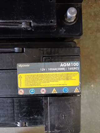 Conjunto de dos baterías AGM de 100Ah, ideales para camper o autocaravana. Son baterías de doble propósito con tecnología AGM. - Marca: Vtpower - Modelo: AGM100 - Voltaje: 12V - Capacidad: 100Ah (20HR) - Corriente de arranque en frío (RC): 160A