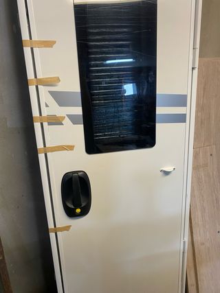 Puerta de autocaravana en color blanco con detalles grises. El policarbonato esta roto pero el cristal esta impoluto - Tirador negro. - medidas marco 1900x640mm