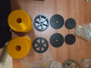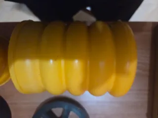 Set de topes de suspensión para camper y autocaravana. Fabricados en goma negra y plástico amarillo. - 2 topes de goma negros grandes. - 2 topes de goma negros pequeños. - 2 topes de plástico amarillo. - 2 ruedas de plástico negro. - Tornillería y tuercas.