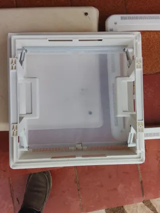 Trampilla de techo para autocaravana. - Material: Plástico transparente y base blanca. - Diseño cuadrado con bordes redondeados. - Mecanismo de apertura visible. - Tiene escurecedor y mosquitera enrrollables 40X40 - Se sustituye para colocar enfriador Viesa