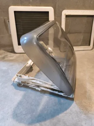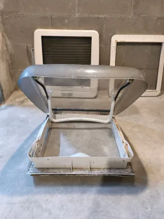 Vendo Claraboya Dometic para Autocaravana o Caravana, está utilizada i desmontada por montar un aire acondicionado, tiene mosquitera i oscurecedor i funciona la abertura i cierra bien, lo único que tiene es un pequeño desperfectos al desmontarla de rotura de plástico lateral.