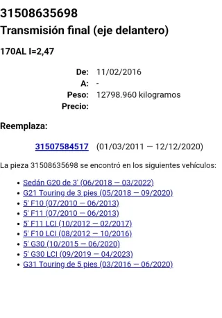 Diferencial delantero bmw 31507584517 Valido para G20 G21 F10 / F11 G30 / G30 LCI G31 PERFECTO ESTADO / 6 MESES DE GARANTIA 663985996