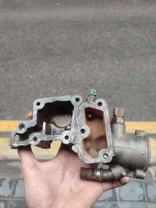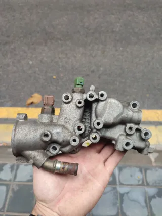 Cuerpo del refrigerante de un Citroën Xsara 1.6i 8v del 99', motor NFZ, tiene los dos sensores de temperatura y funcionan correctamente. Va atornillado al bloque/culata motor y conecta con el termostato atornillado.
