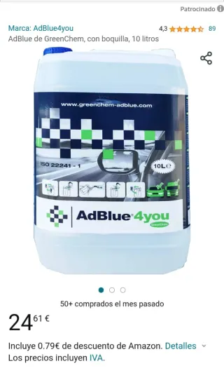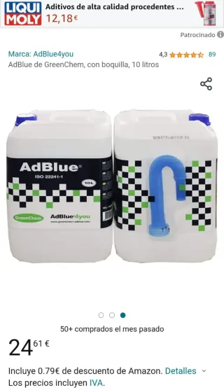 AdBlue de la marca GreenChem. - Apto para turismos y camiones. Con boquilla. De venta en gasolineras Repsol formato de 10 litros, con boquilla para facilitar su uso. - Cumple la norma ISO 22241-1. Escucho ofertas.