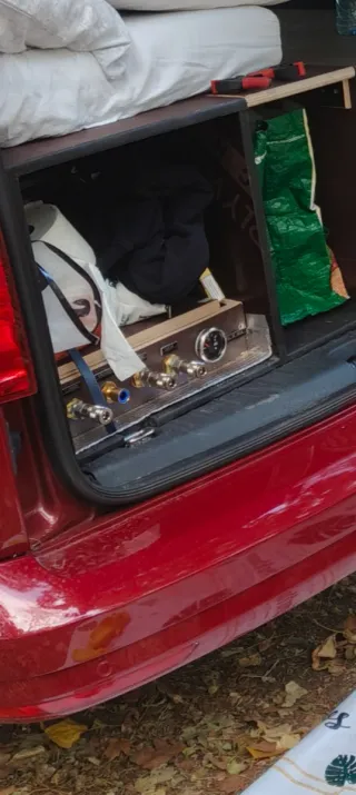Depósito de agua de 50 litros para furgonetas camper. Precio nuevo 54€ - Conexiones para mangueras tipo neumático camión. 60€ - Bomba de agua seaflow serie 21. Precio nueva 28€ - Aforador para nivel de agua con indicador 53€ Precio de todo nuevo 195€. - Toma exterior con enchufe rápido para ducha ( regalo la ducha con enchufe rápido) y otra interior para instalar un grifo. Está nuevo. Solo lo he llegado a probar una vez y es una maravilla. Lo vendo por qué después de montarlo, me di cuenta que era muy grande para mí Caddy.