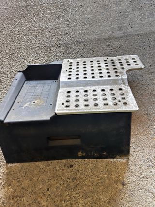 Tapa de batería para camión Volvo. Pieza de plástico negro con una cubierta metálica perforada. - Cubierta metálica con múltiples orificios. - Base de plástico negro. - Marca: Renault Trucks.