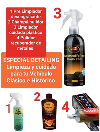 Kit Detailing para la limpieza profunda de calidad de tu vehículo Clásico e Histórico. Todo lo necesario para una limpieza especializada con productos de calidad. Cualquier duda ofrecemos asesoramiento sin problema. Tambien válido para cualquier tipo de vehículo. Descripcion de cada producto en las fotos, tambien se venden por separado. Mas productos Añadimos a este Kit de Detailing un paño de microfibra. Autosol, BARDAHL, Quixx, pulimento, pulidor, detailing. Metal Polish, Seat, renault, fiat, 600, R5, R4. Coche, miniatura, escla, juguete, coleccion, seat, ibiza, altea,exeo, mii, cordoba, toledo, arona, arosa, 90,80,70