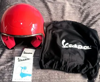 Casco rojo de Vespa, sin estrenar. Incluye funda protectora. - Color rojo brillante. - Diseño clásico Vespa. - Incluye funda negra con logo Vespa.