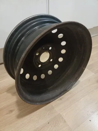Llanta de acero para coche, con un diseño clásico de agujeros. - Material: Acero. - Color: Negro. - Diámetro: 15 pulgadas (aproximado). - Patrón de pernos: 4x100 (aproximado).