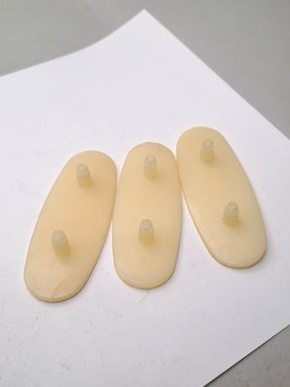 Set de tres porta insignias de plástico. - Diseño ovalado. - Color marfil. - Cada pieza tiene dos pequeños postes para fijación.