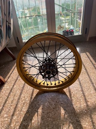 Llanta trasera dorada. - Llanta de color dorado. - Diseño de radios negros.