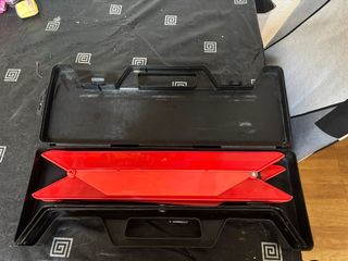 Triángulo de señalización de emergencia para vehículos, diseñado para garantizar la seguridad vial. - Color rojo reflectante. - Incluye su caja de almacenamiento negra.