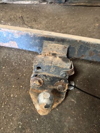 Se vende bola de remolque con su soporte para Nissan Patrol Y60. Pieza metálica con acabado en pintura gris y detalles oxidados. - Bola de remolque. - Soporte de montaje.