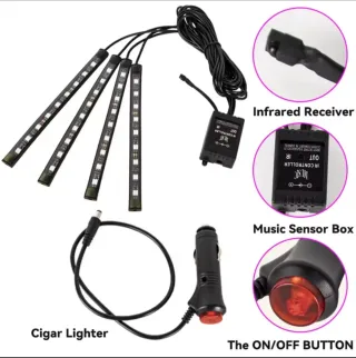 Kit de luces ambientales RGB para el interior de tu coche. Incluye tiras LED y control. - Cuatro tiras LED. - Receptor infrarrojo. - Caja de sensor musical. - Cable USB inteligente.